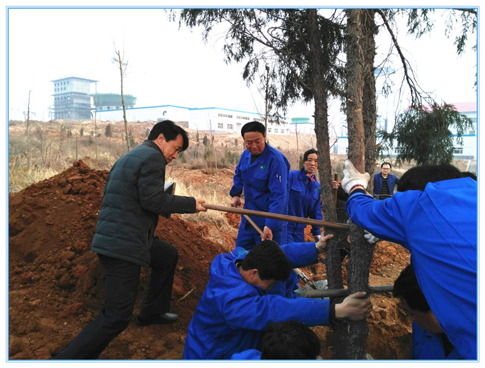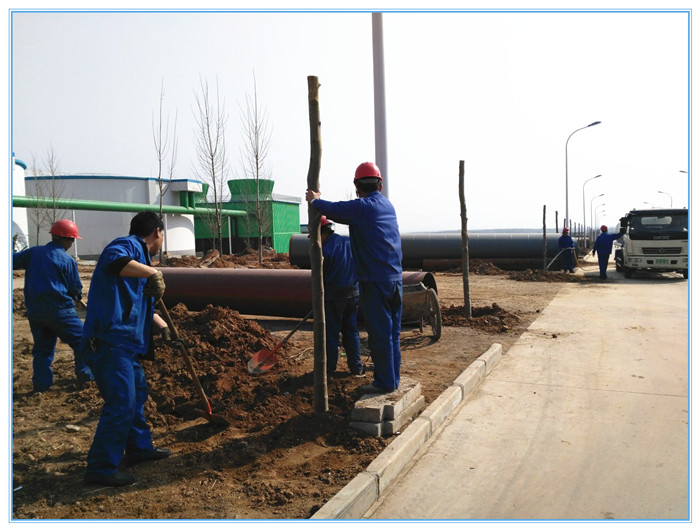今年集团公司针对厂区绿化工作,提出了严格要求,制定了树木栽植标准,树坑标准为直径1.5/1m、深1m,坑内无乱石、杂物,换土0.5m以上;树坑间距为6m,中心成一条直线;路旁树坑与马路平行,树坑中心距路沿1m。栽植时要根据树根情况进行前后对照,保证横平竖直;然后进行培土、压实,填土时不准把石头、垃圾等杂物填入树坑;栽种后2小时内进行浇水,水冲处不露树根,有倒伏或倾斜树木要及时扶直踩实。两天内完成二次培土,覆土到树根距离不超过20cm,覆土到地面距离为8-12cm。